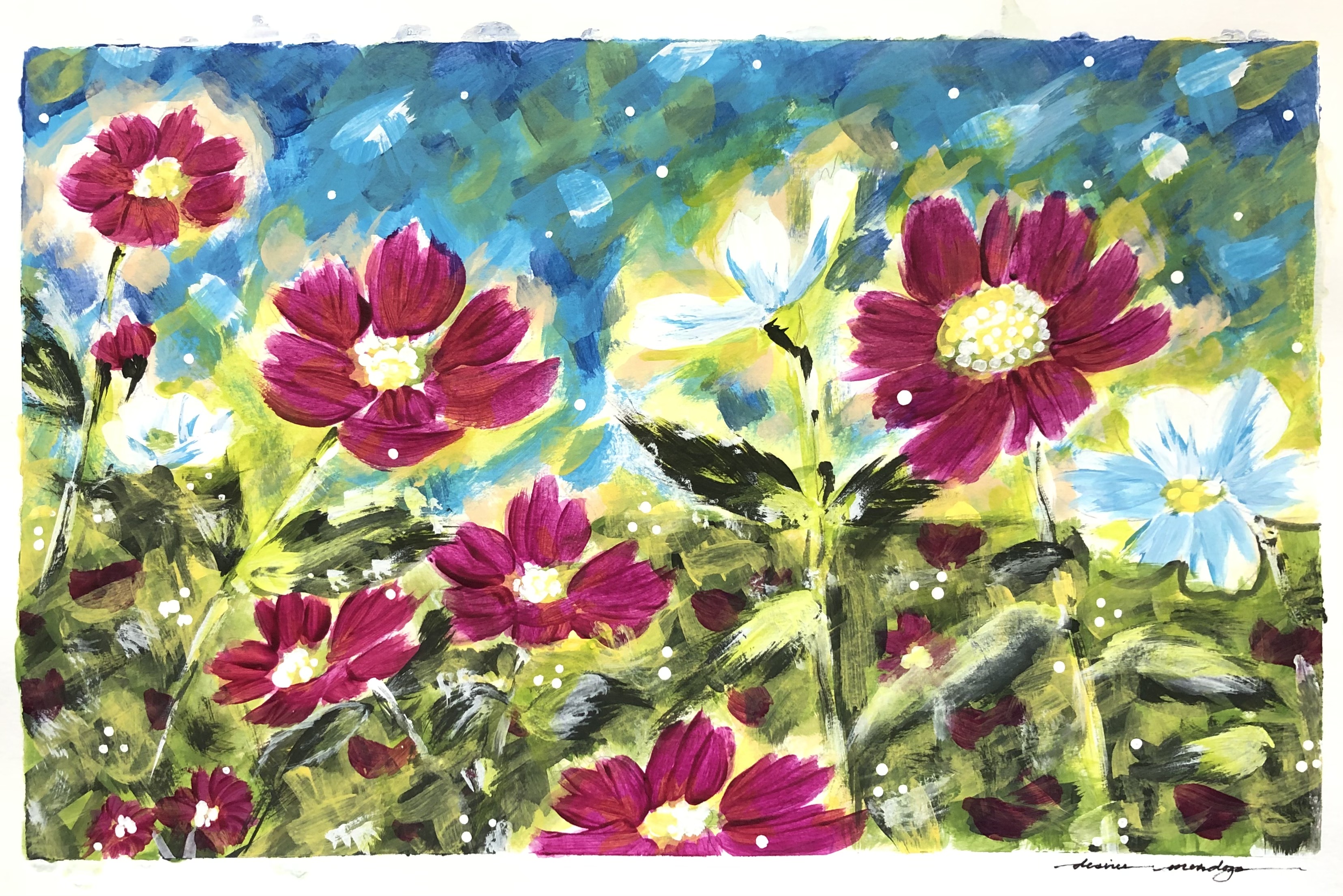 Desiree Mendoza: "Peaceful Blooms" is an acrylic I did during this pandemic, and it reminds me of the beauty of God and His creation; who He is in my life: and the wonderful people who purposefully place their hope and trust in Him. In the midst of this pandemic, this artwork reminds me that we can all be peaceful and hopeful when we trust God and His Word. (Cosmos flowers also symbolize peace.) |