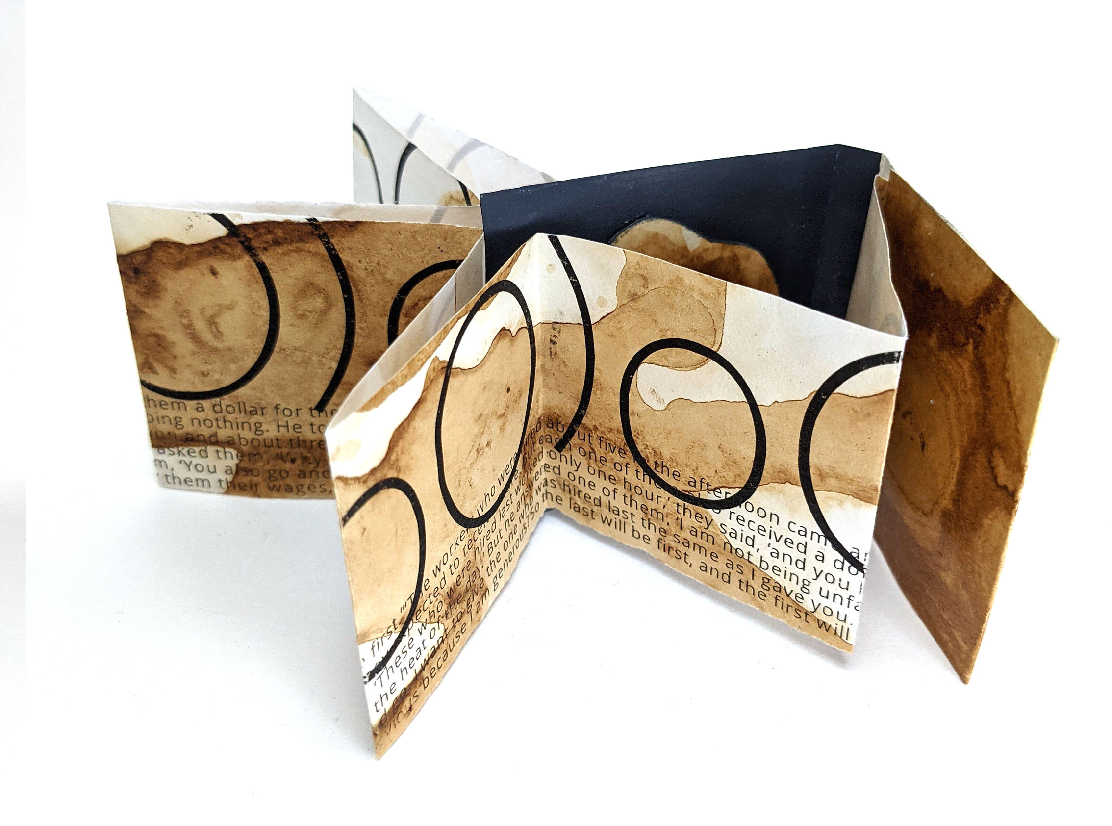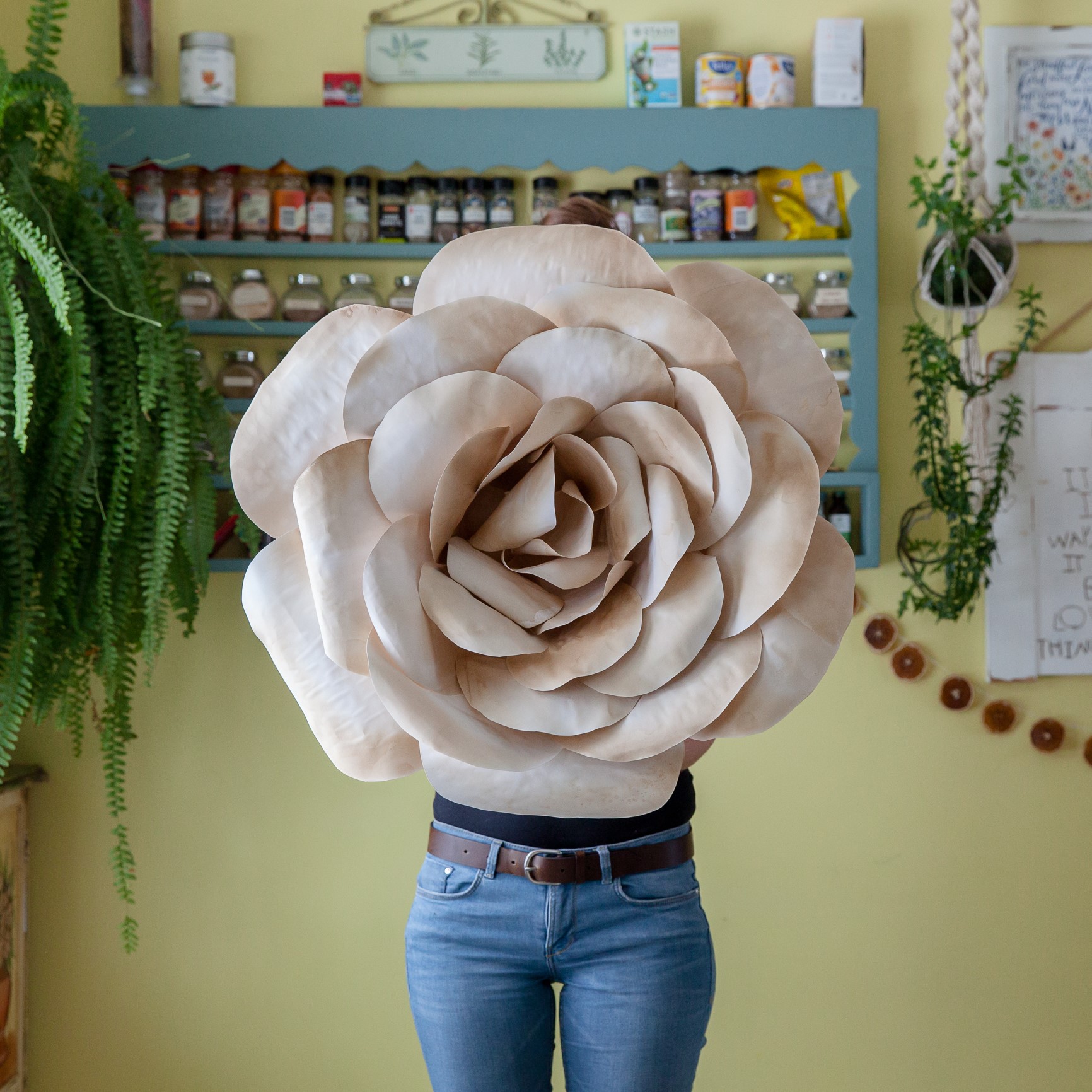 Size of flowers (see related image at right) by Lee-Anne Haggett. I made these flowers out of paper and dyed them with tea to give them depth and texture. This photo gives you a better sense of how big they are than the photo at right. |